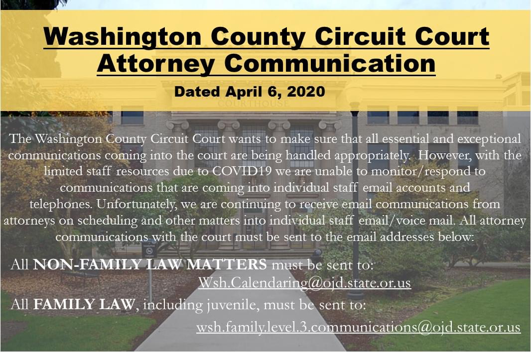 Yamhill County is currently at the Extreme Risk Covid-19 level pursuant to Executive Order 20-66. Oregon Supreme Court Chief Justice Order(CJO) 20-047, “Order Imposing In-Person Restrictions on Court Operations During Statewide ‘Freeze,’” is currently in effect. The court is following the Chief Justice Order. The restrictions on conducting jury trials will remain in effect until the CJO 20-047 is terminated. At that time jury trials will resume two weeks following the lifting of the CJO’s restrictions.